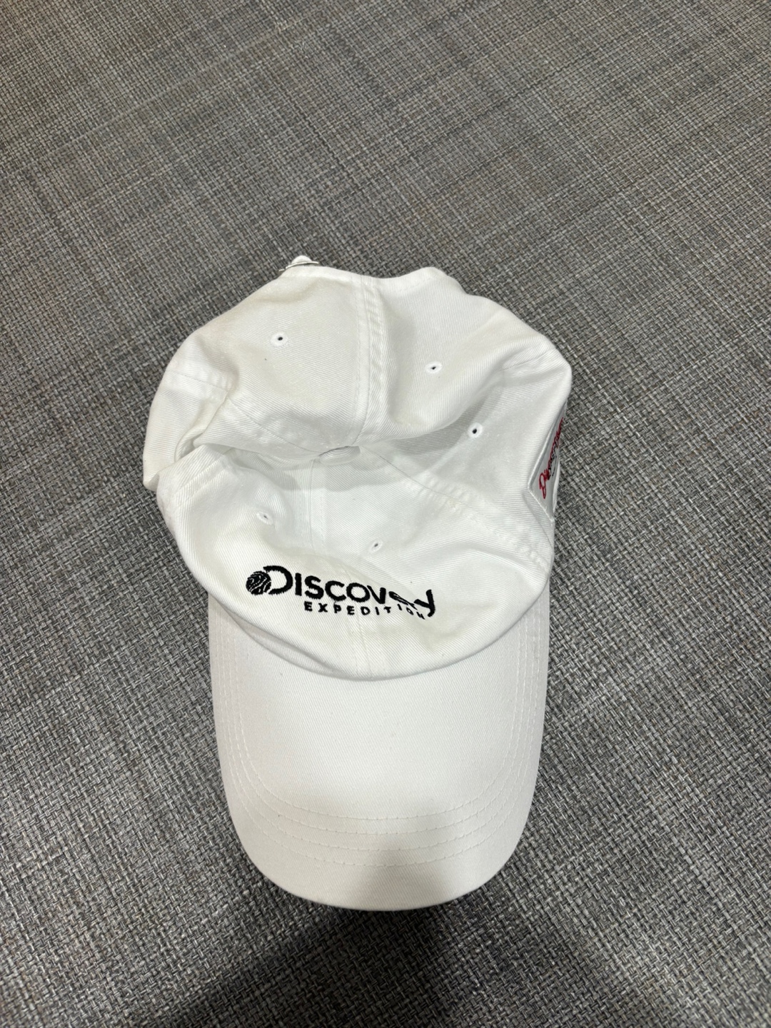 흰색 볼캡모자, 검정색 디스커버리 글씨 로고 있음