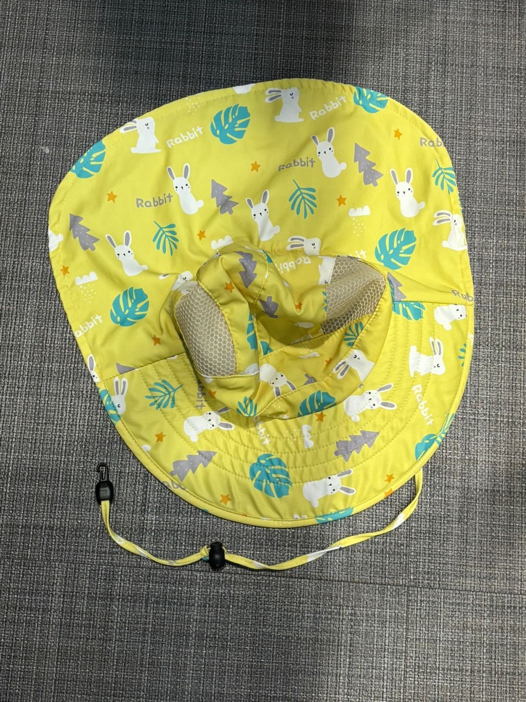 노란색 바탕, 흰토끼, 나무, 나뭇잎 무늬 있는 유아용 수영모자