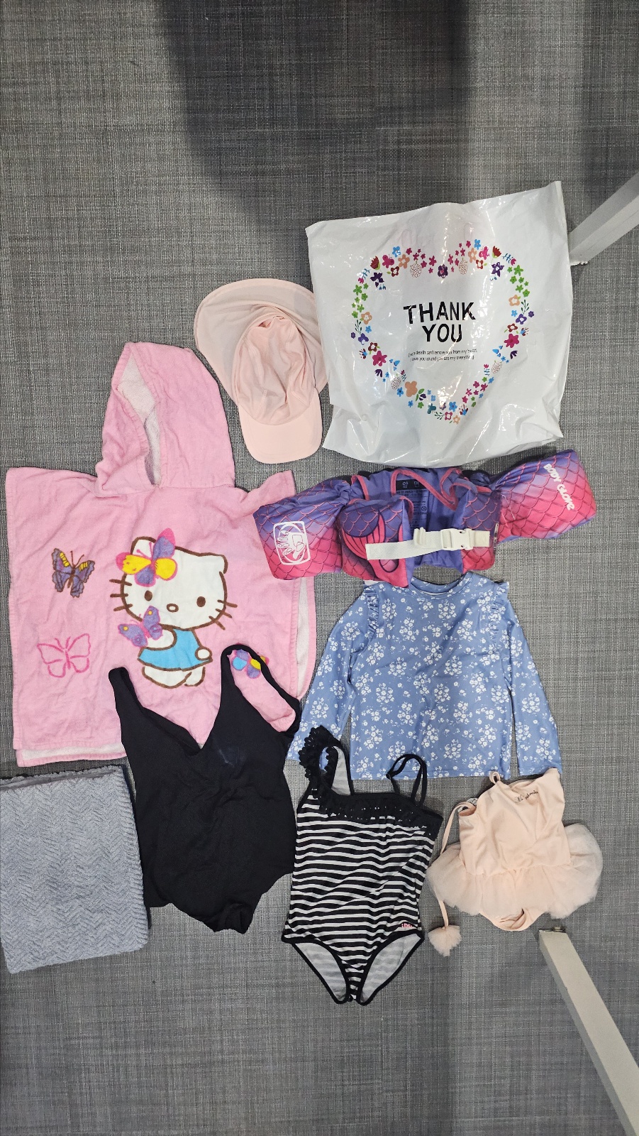 물품명 : 비닐가방 내 수영복, 후드타올, 암형구명조끼, 타올, 속옷, 수영모자