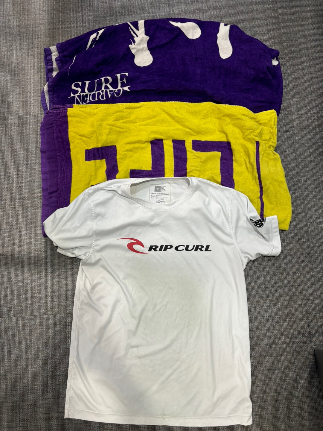 (644) - [서프존] 반팔티,비치타올 24.07.17 미처리 서프존 의무실 앞 습득물품: 서프가든 보라색,흰색 비치타올1개, 보라색,노란색 비치타올1개 립컬 흰색 기능성 반팔티 M사이즈 모자 리쉬 목록으로