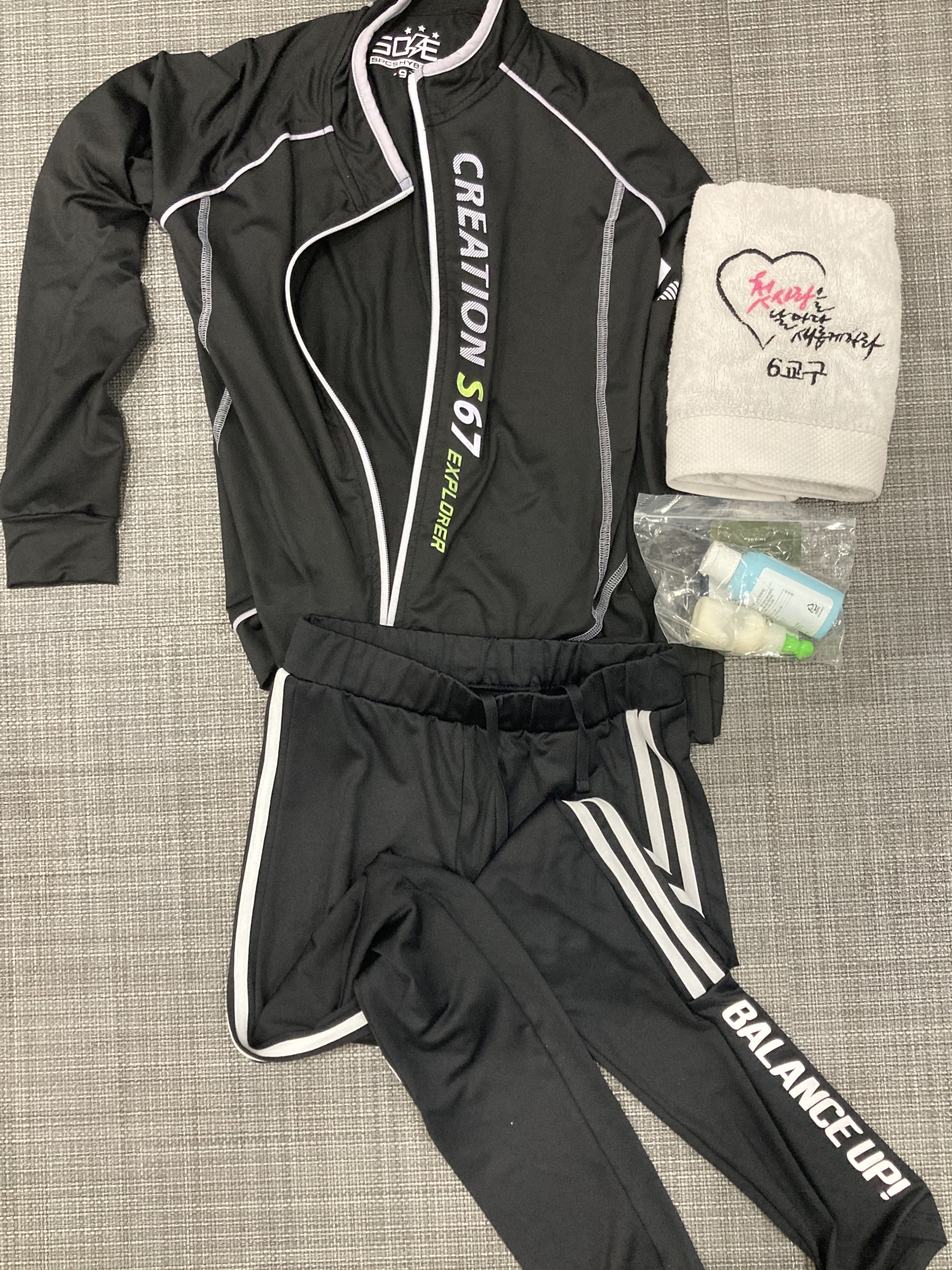 습득물품 : SOSE 검은색 래쉬가드 상/하의, 하얀 수건 및 세면용품