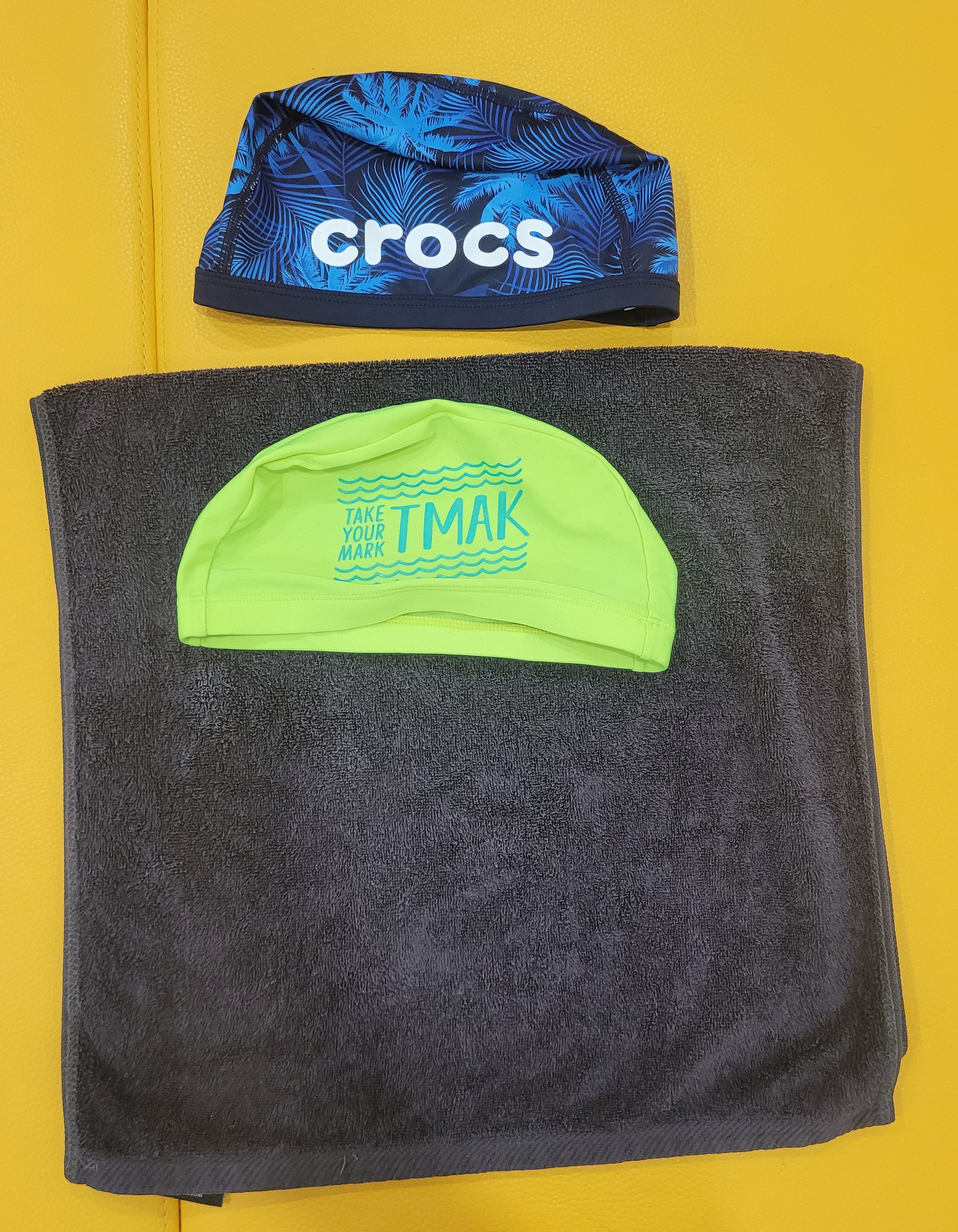 습득물품 : 진한회색수건, 형광색TMAK 수영모 , 파란색 야자수 무늬 CROCS 수영모