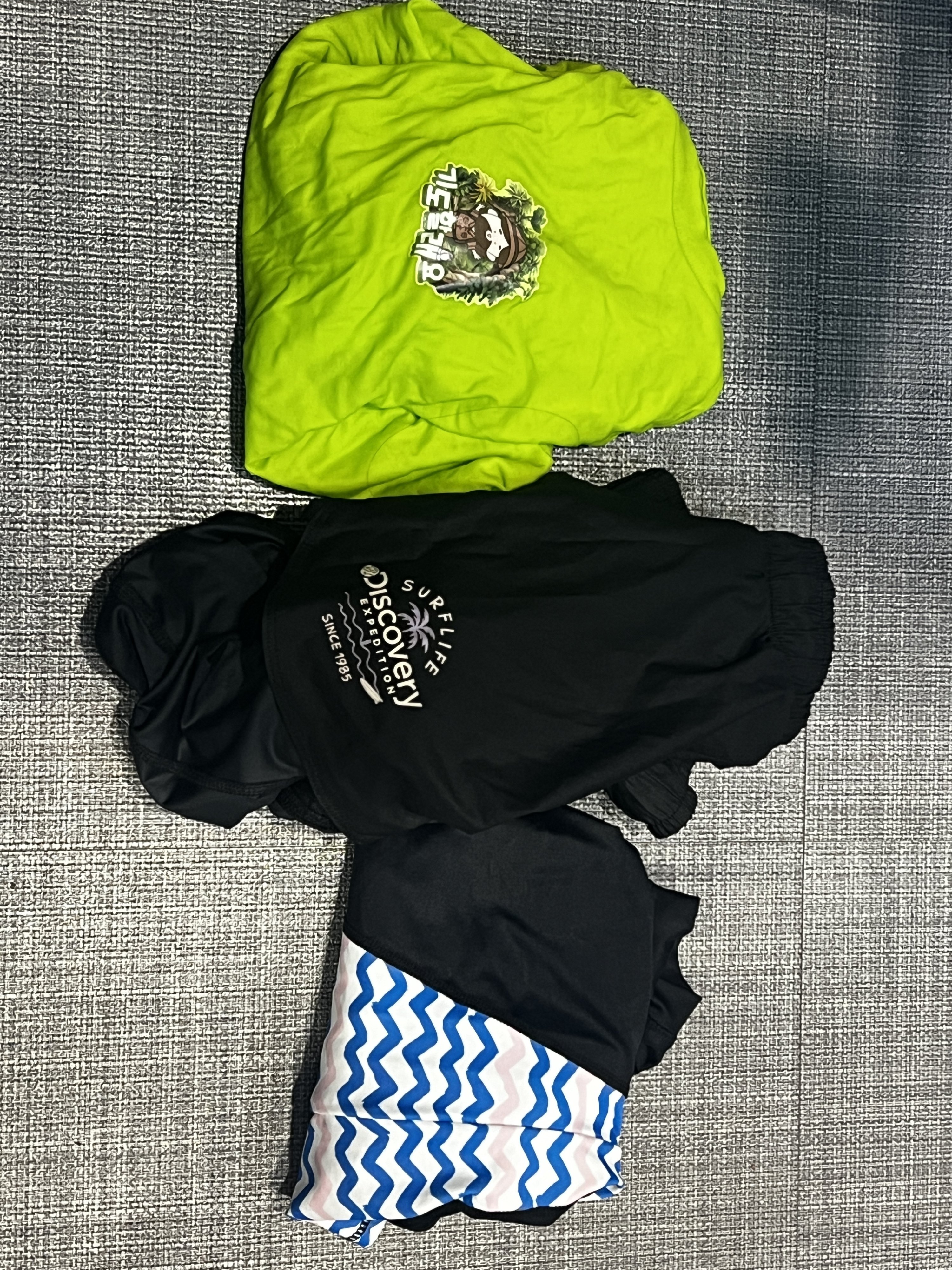 습득 물품 : ‘기도할래요’ 형광 연두색 티셔츠, 디스커버리 검정색 하의, BALLOP 검정색 & 파란색, 핑크색 줄무늬가 있는 상의