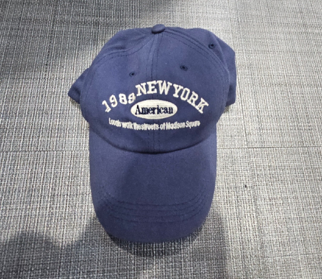 특징 : 남색 캡모자, 1989, new york 자수글씨