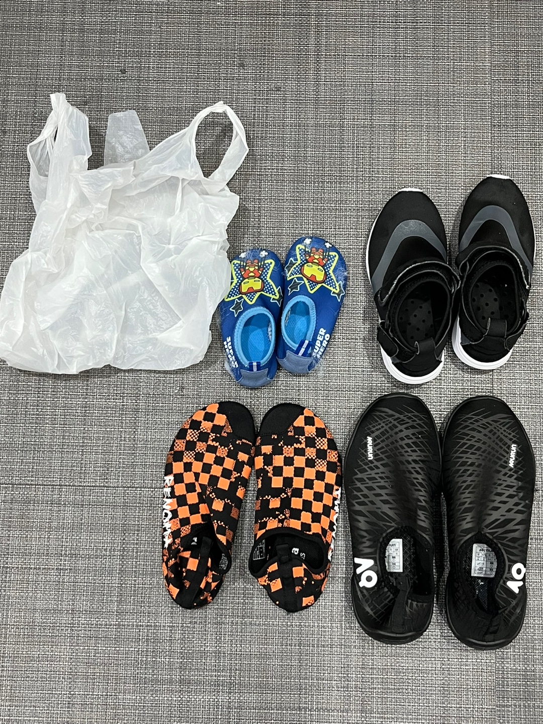 특징: 하얀 비닐봉지에 아쿠아슈즈 (260, 230, 190, 160) 들어있음