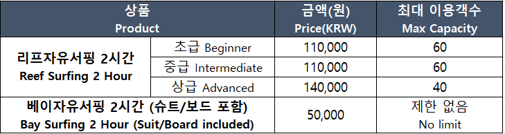: 이용일 2일전 16시 기준 리프 서핑 예약률 30% 이상 시 오픈(운영 여부 개별 문자 안내)