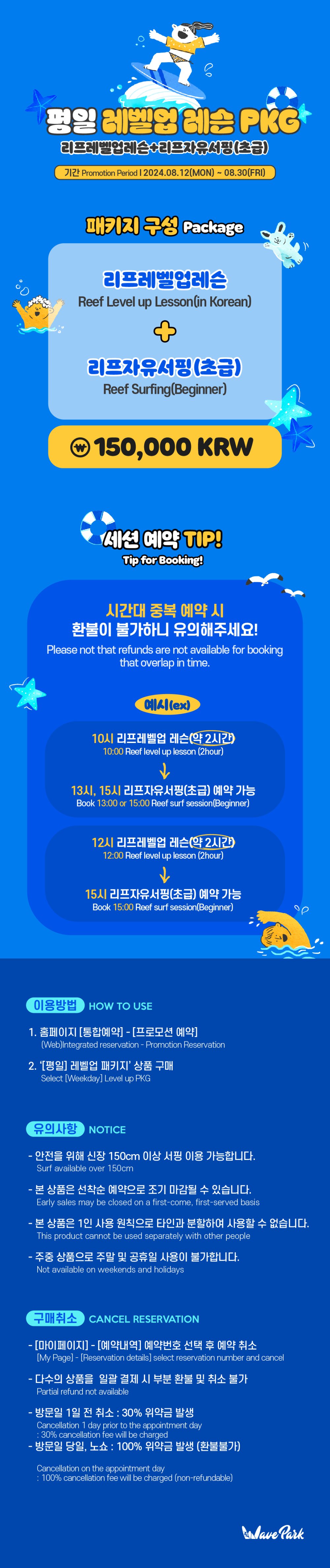 [평일]리프레벨업PKG 24.08.09 ~ 24.08.30 ※ 시간대 중복 예약시 환불이 불가하니 이용세션 시간시간과 끝나는 시간을 확인부탁드립니다. 8월 코치 프라이빗 서프 레슨 보물찾기 이벤트 목록으로