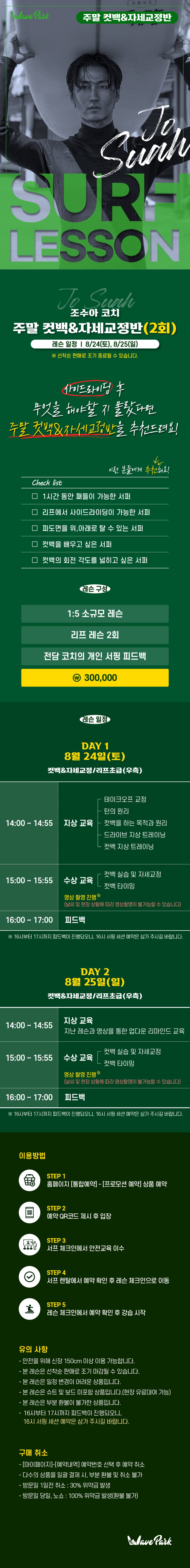 [조수아 코치] 주말 컷백&자세교정반(2회) 24.08.24 ~ 24.08.25 ※ 레슨 첫째 날짜에 맞게 예약 및 결제 바랍니다. 이후 일정은 별도 안내 예정입니다. [AFTER1] 미오코스타 평일 입장 할인 8월 코치 프라이빗 서프 레슨 목록으로