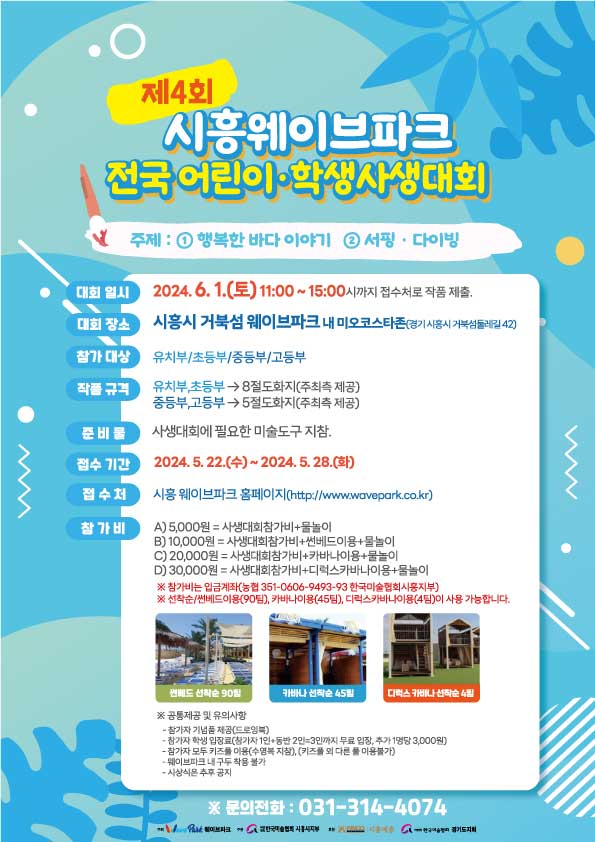 제4회 웨이브파크 전국 어린이,학생 사생대회 안내 24.05.18 자세한 대회 요강은 5월 21일(화) 웨이브파크 홈페이지에 업로드 됩니다. 제4회 웨이브파크 전국 어린이,학생 사생대회 상세 요강 & 접수 안내 (추가 접수 오픈) [휴장안내] 5/19(일) '제3회 시흥시장배 국제서핑 대회' 진행 관련 휴장 안내 목록으로